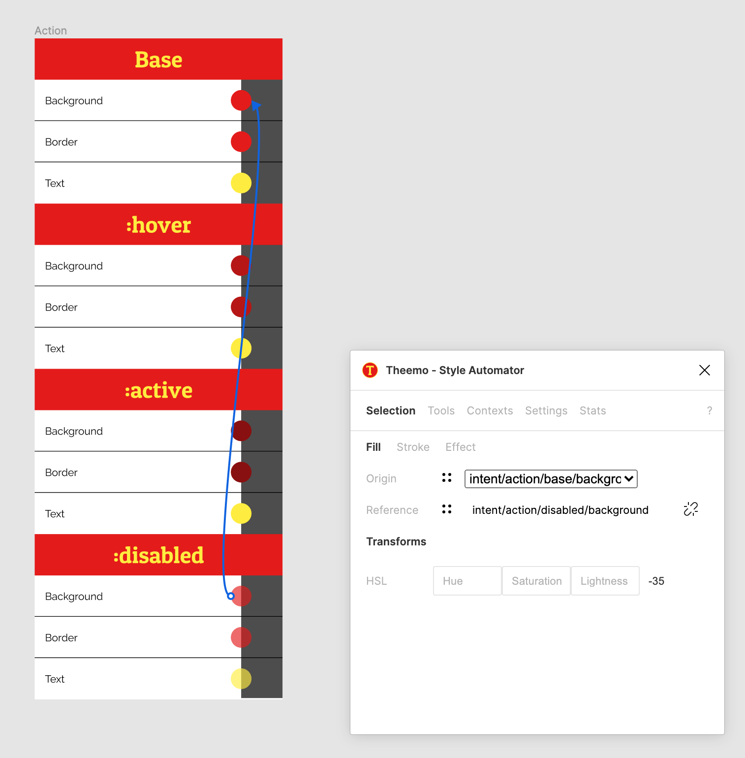 Transforms are a welcome addition on top of references. Available for paint styles (Fill and Stroke). When styles are referenced from origin to reference you can put transforms in between to manipulate HSL and opacity values which are calculated during referencing.